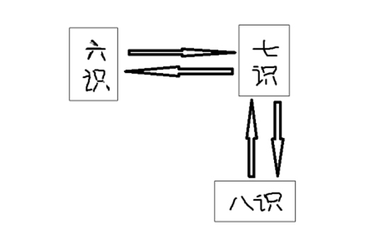 ①—⑥為“六識”,對應“六塵”:色、聲、香、味、能、法塵;“六根”:眼、耳、鼻、舌、身、意根。
